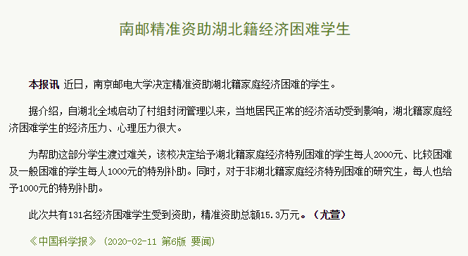 【中国科学报】南邮精准资助湖北籍经济困难学生