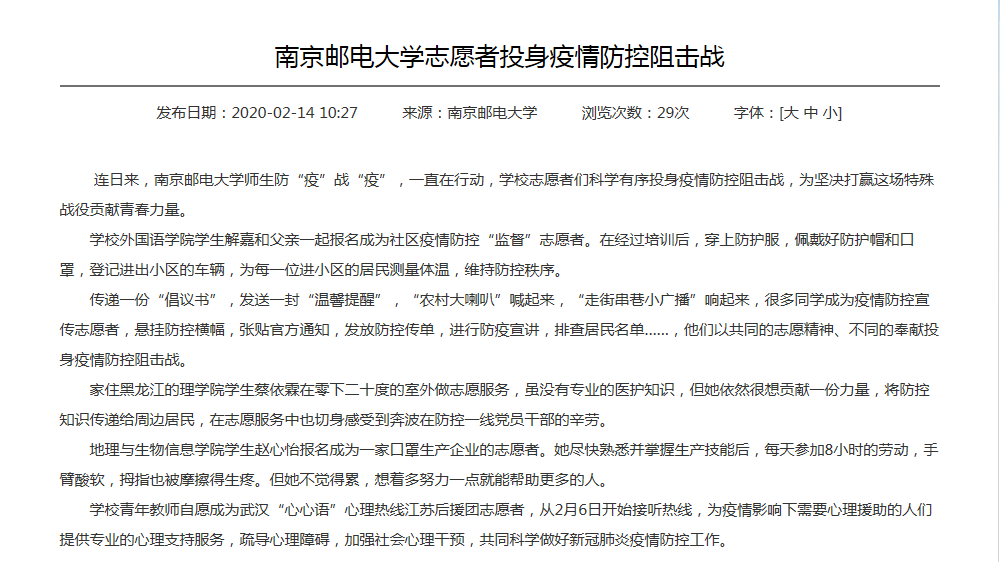 【江苏教育】南京邮电大学志愿者投身疫情防控阻击战