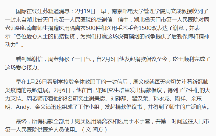 【中央广电总台国际在线】南京邮电大学管理学院周文成教授收到来自湖北天门的感谢信