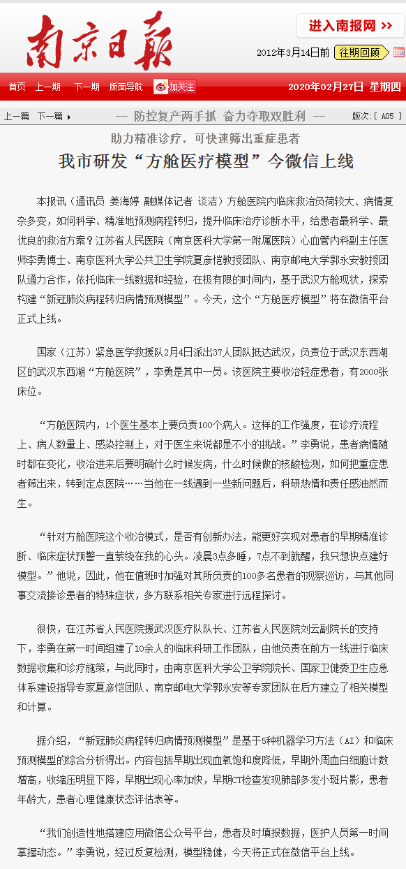 【南京日报】我市研发“方舱医疗模型”今微信上线