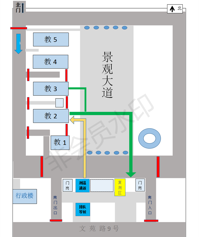 1.禁止一切机动车辆进出南门(8月23日6:00-18:00)。因南门周边区域搭设答辩人员专用通道,周边道路须实施交通管制,禁止一切机动车辆进出南门。(见图)