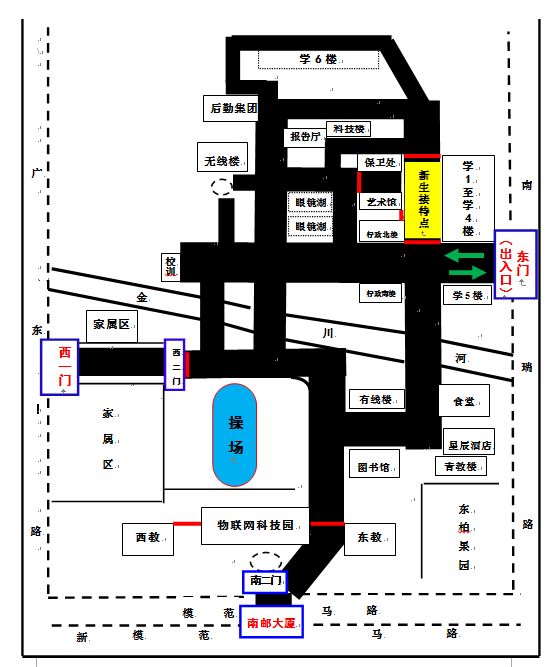 1.三牌楼校区报到点设置在东门附近学4楼西边马路上,东门(南瑞路)为2020级新生报到指定通道。送学车辆可停放在东门外南瑞路上,即停即走。