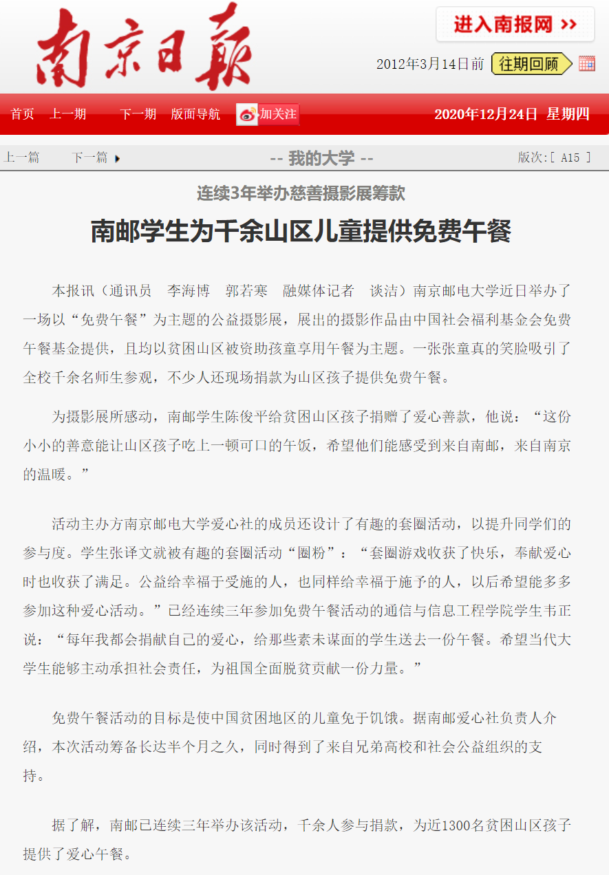 【南京日报】南邮学生为千余山区儿童提供免费午餐