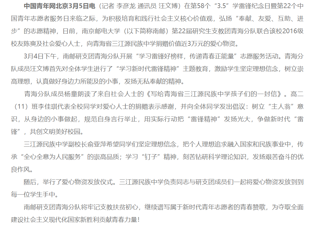 【中国青年网】南邮研支团在三江源学习雷锋传递青春正能量