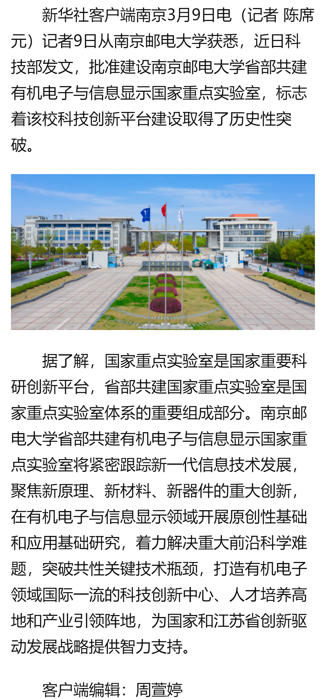 【新华社客户端】南京邮电大学获批省部共建有机电子与信息显示国家重点实验室
