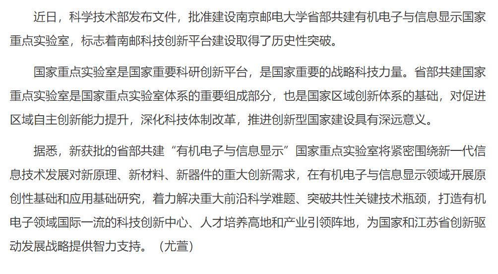 【新华网】南京邮电大学“有机电子与信息显示”国家重点实验室获批