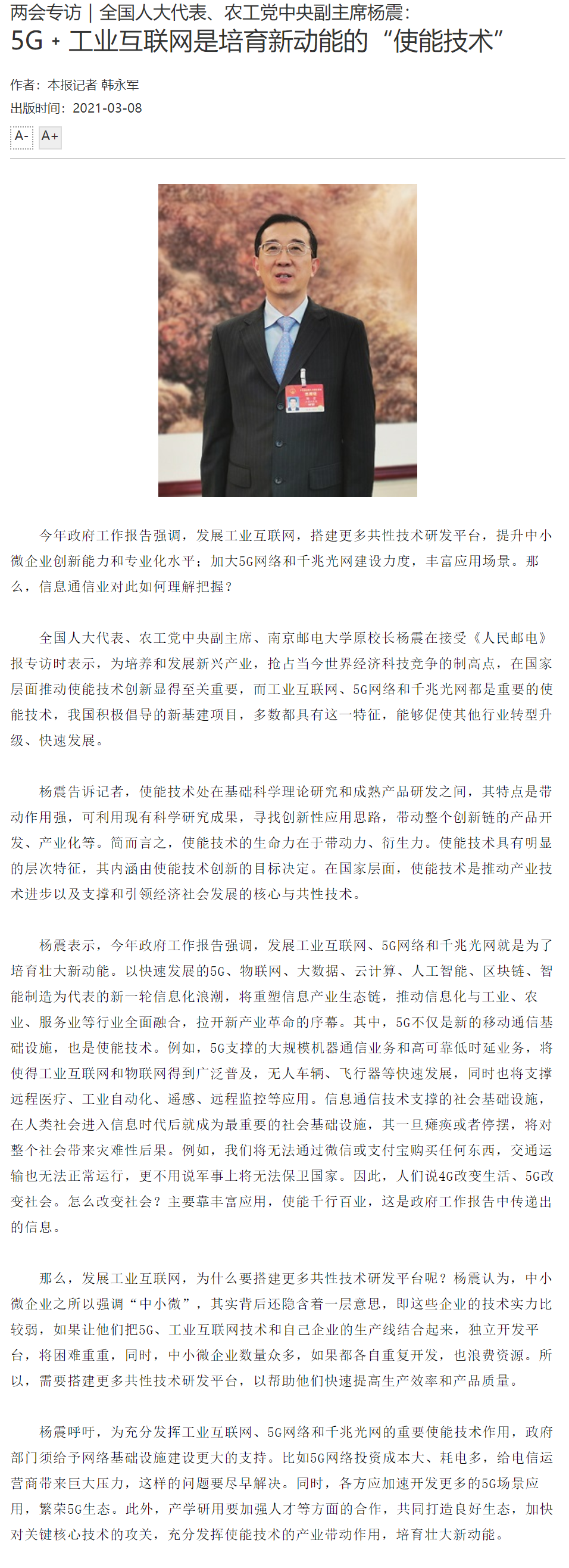 【人民邮电报】全国人大代表、农工党中央副主席杨震:5G﹢工业互联网是培育新动能的“使能技术”