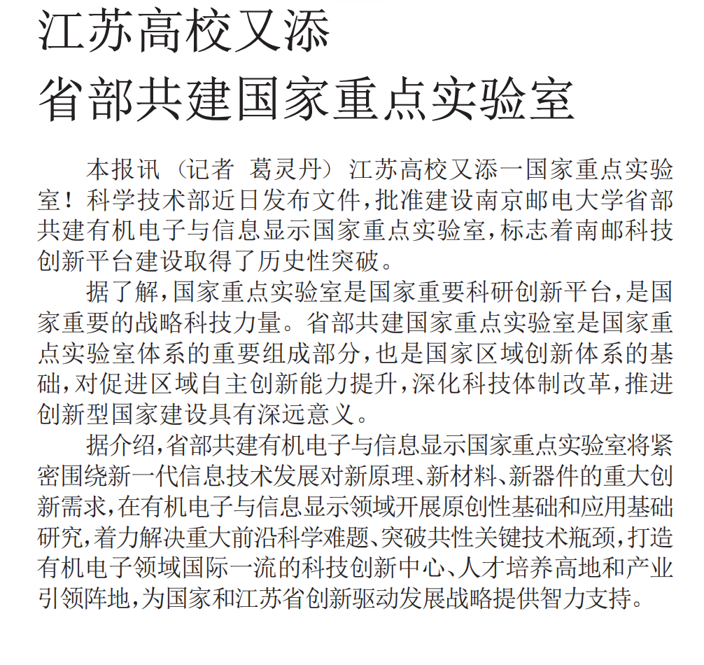 【新华日报】江苏高校又添省部共建国家重点实验室