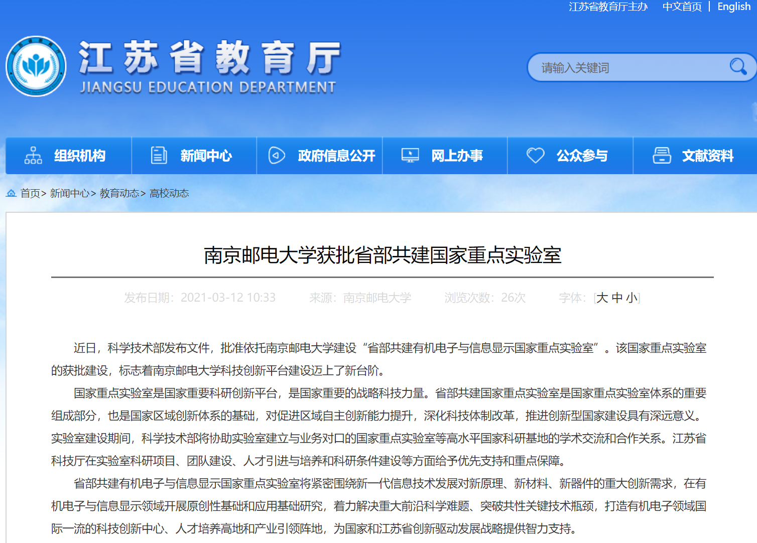 【省教育厅官网】南京邮电大学获批省部共建国家重点实验室