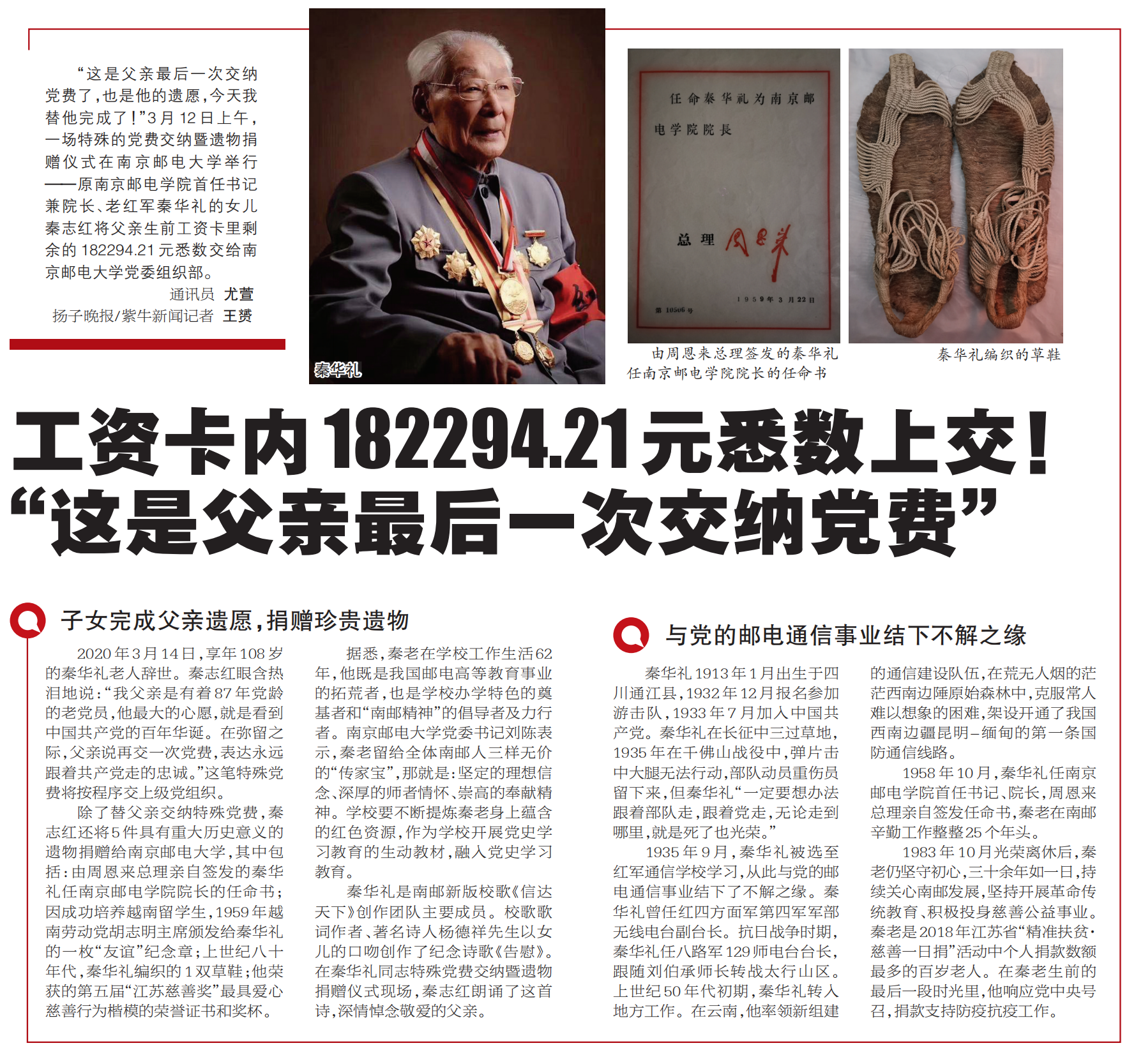 【扬子晚报】工资卡内182294.21元悉数上交! “这是父亲最后一次交纳党费”