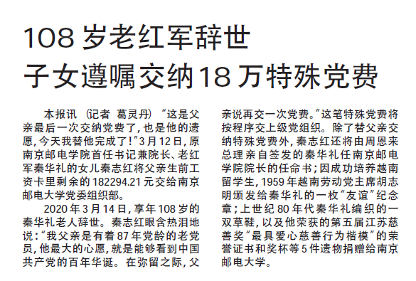 【新华日报】108岁老红军辞世 子女遵嘱交纳18万特殊党费