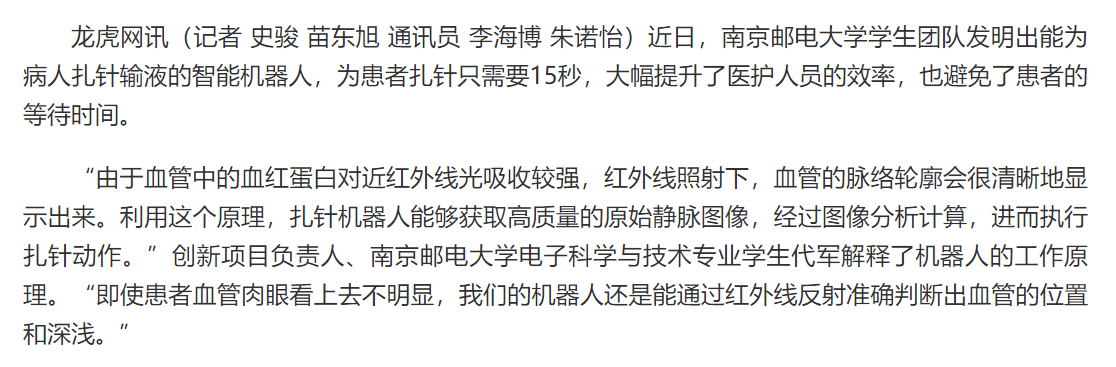 【龙虎网】机器人给病人扎针输液?南邮学子打造医疗新帮手