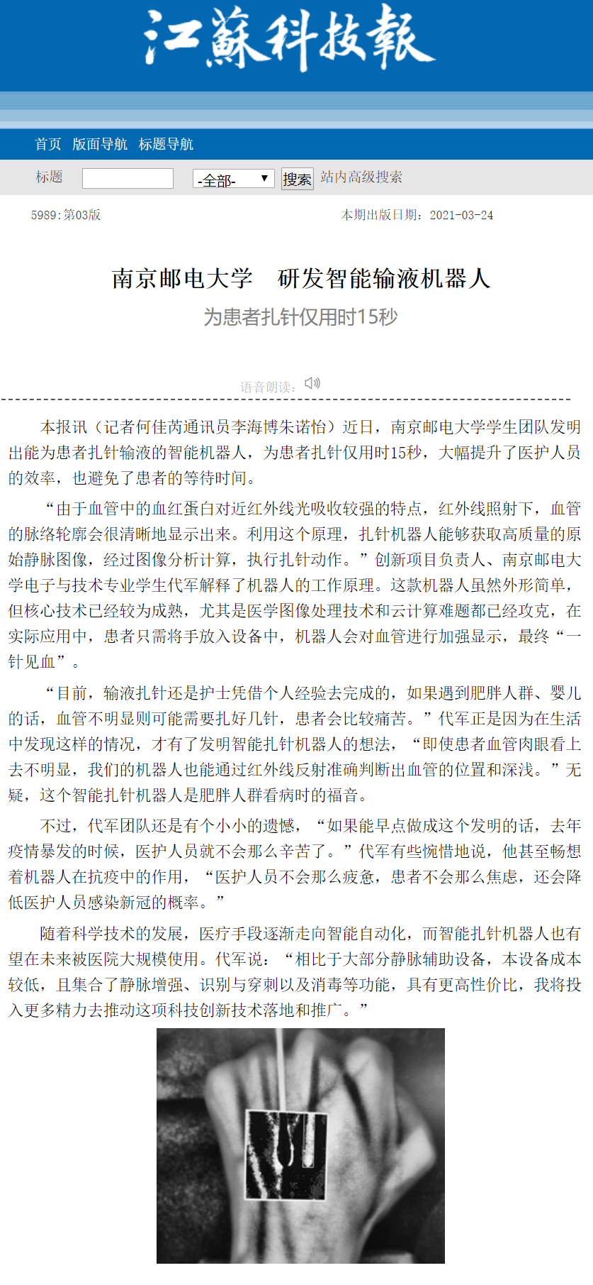 《江苏科技报》南京邮电大学 研发智能输液机器人