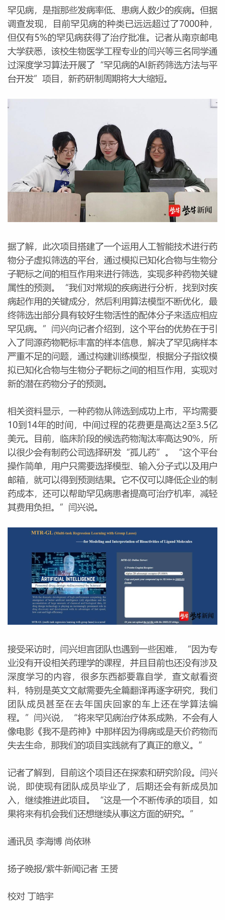 【扬子晚报客户端】助力罕见病新药筛选,南邮科研团队用上人工智能