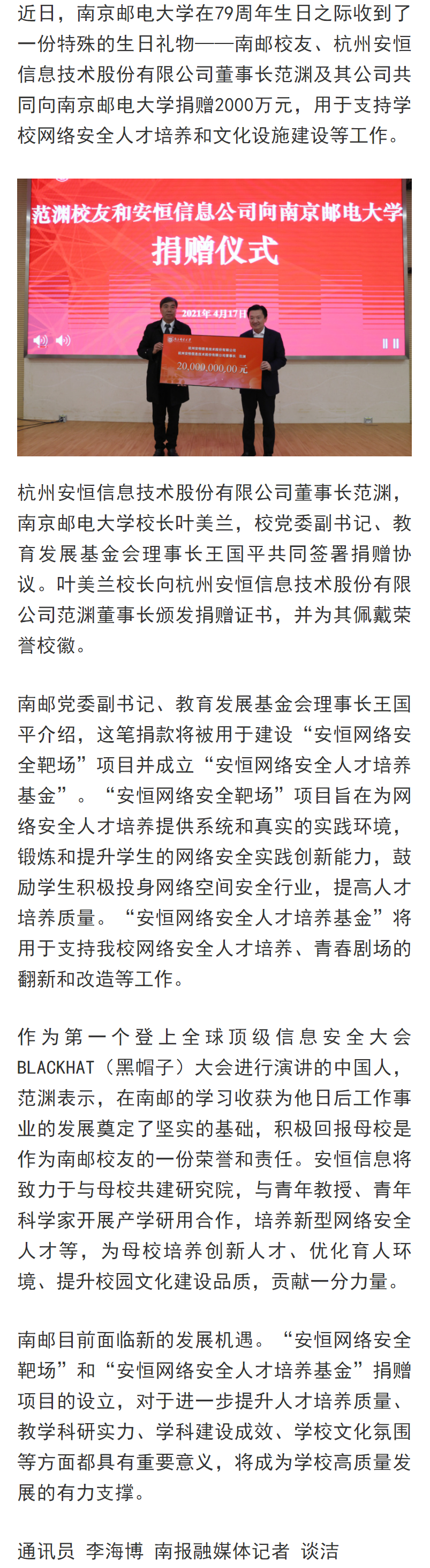 【南京日报客户端】2000万元!南邮生日之际收到一份特殊的礼物