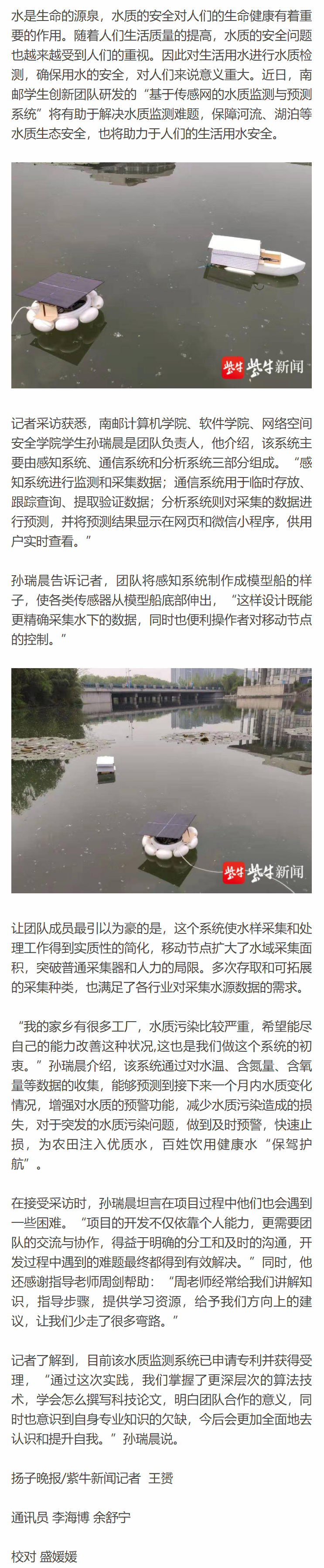【扬子晚报客户端】能预测一个月内水质变化,南京大学生的这项发明解决水质监测难题