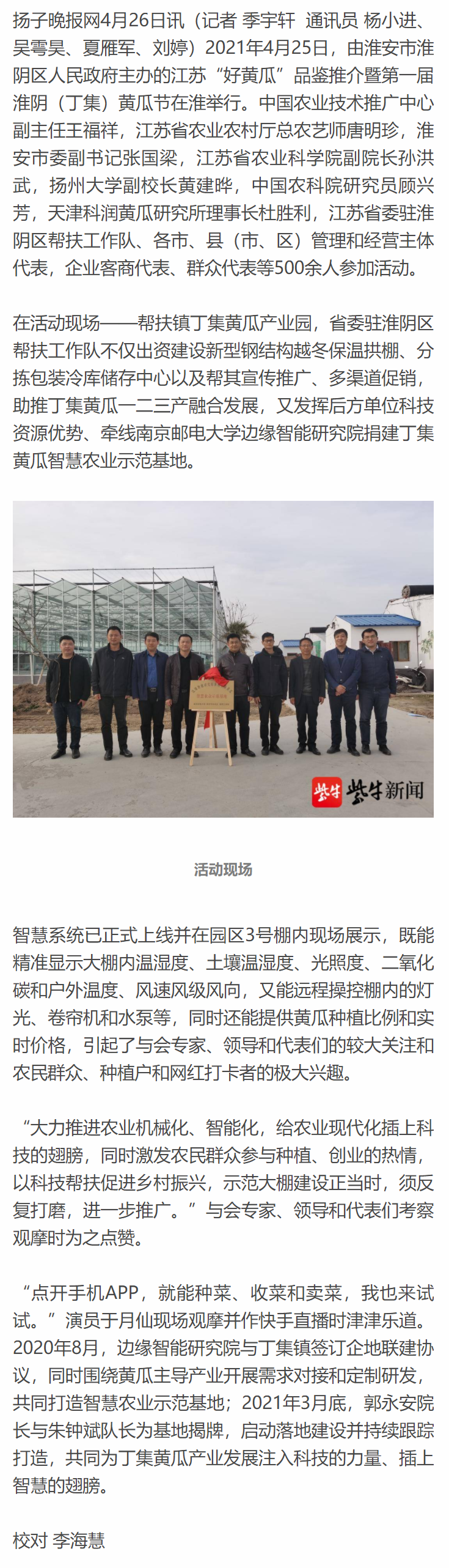 【扬子晚报客户端】淮阴黄瓜香,科技帮扶强 ——南京邮电大学边缘智能研究院助力淮阴黄瓜节