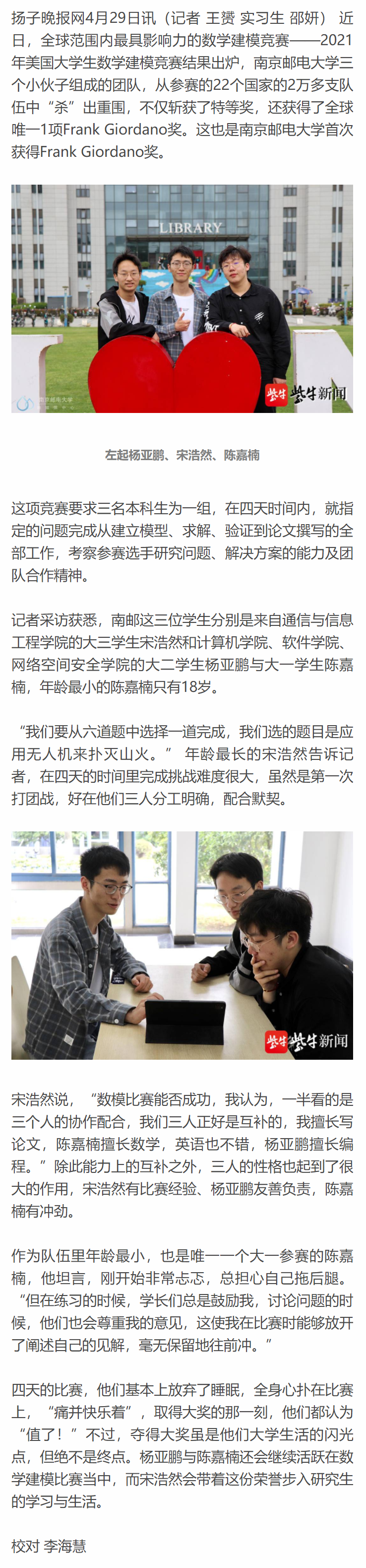 【扬子晚报客户端】PK全球2万支队伍,大学生数学建模竞赛最高奖被这仨小伙斩获,最年轻队员仅18岁