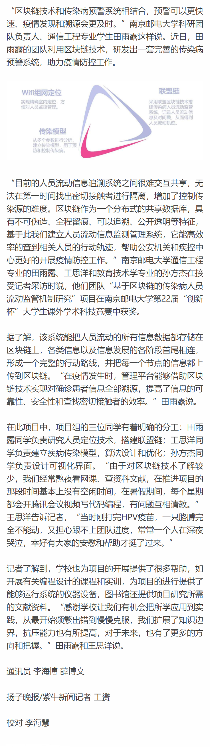 【扬子晚报客户端】“区块链+疫情预警”,南邮科研团队研发传染病预警系统
