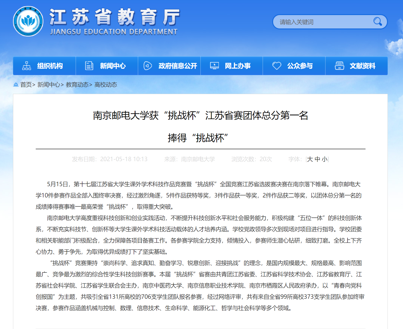 【省教育厅官网】南京邮电大学获“挑战杯”江苏省赛团体总分第一名 捧得“挑战杯”