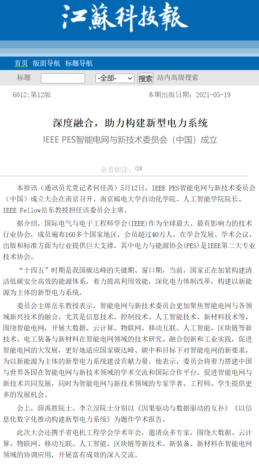 【江苏科技报】深度融合,助力构建新型电力系统 IEEE PES智能电网与新技术委员会(中国)成立