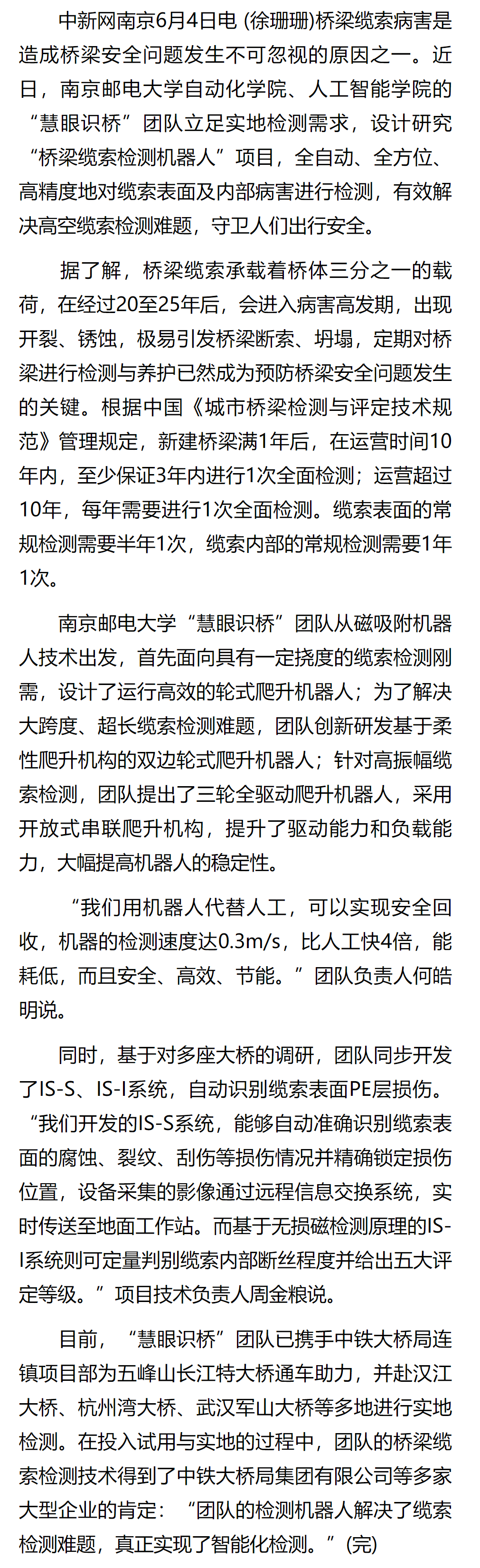 【中国新闻网】南京高校团队设计桥梁缆索检测机器人“慧眼识桥”