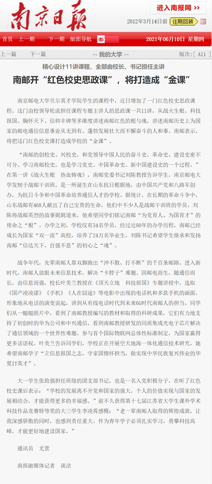 【南京日报】南邮开“红色校史思政课”,将打造成“金课”