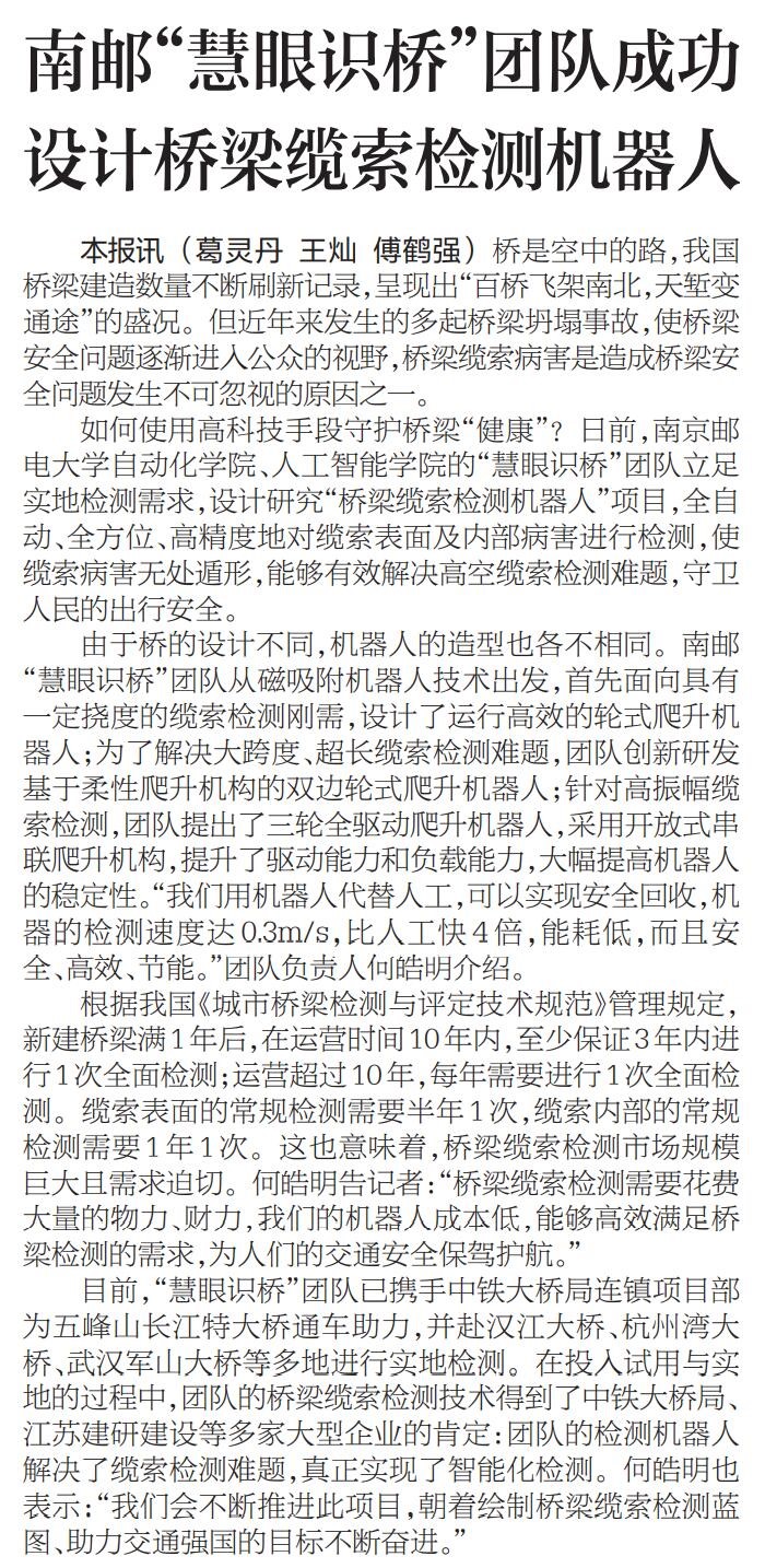【新华日报】南邮“慧眼识桥”团队成功设计桥梁缆索检测机器人