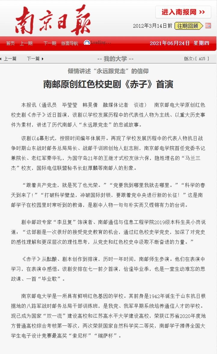 【南京日报】南邮原创红色校史剧《赤子》首演