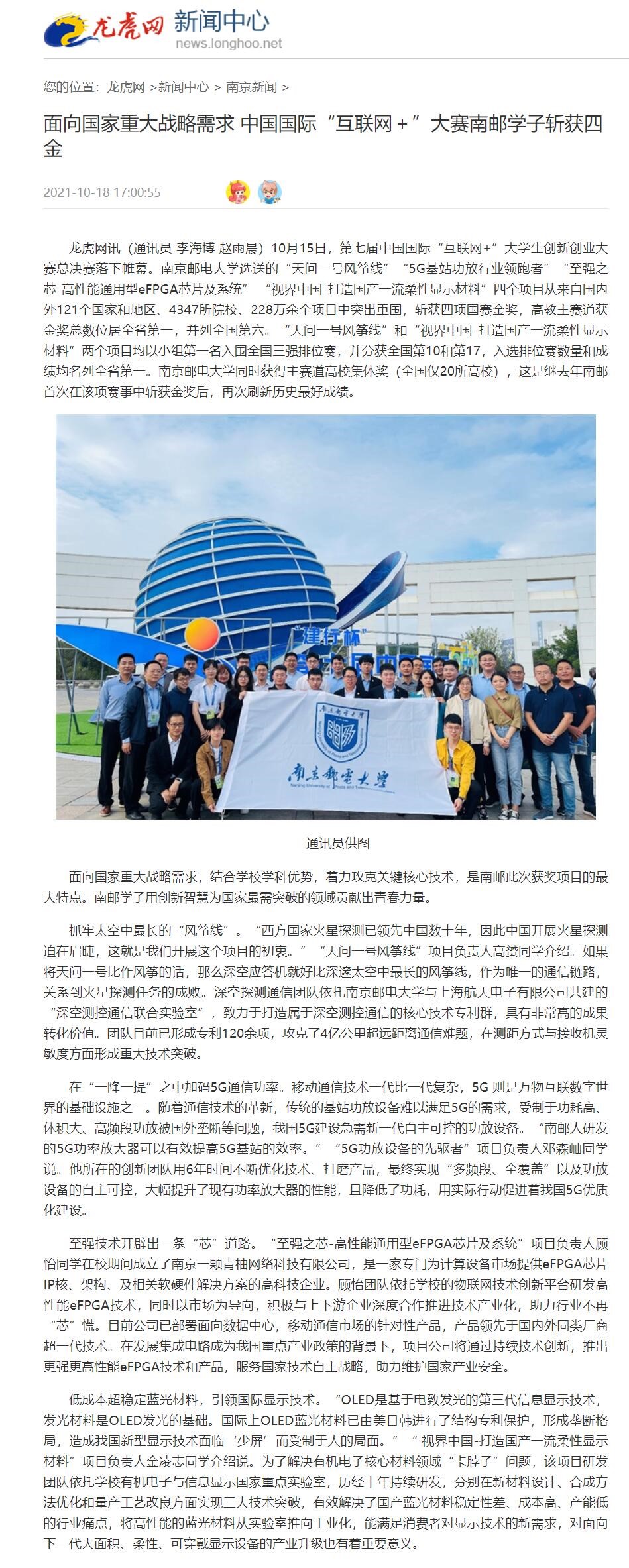 【龙虎网】面向国家重大战略需求 中国国际“互联网+”大赛南邮学子斩获四金