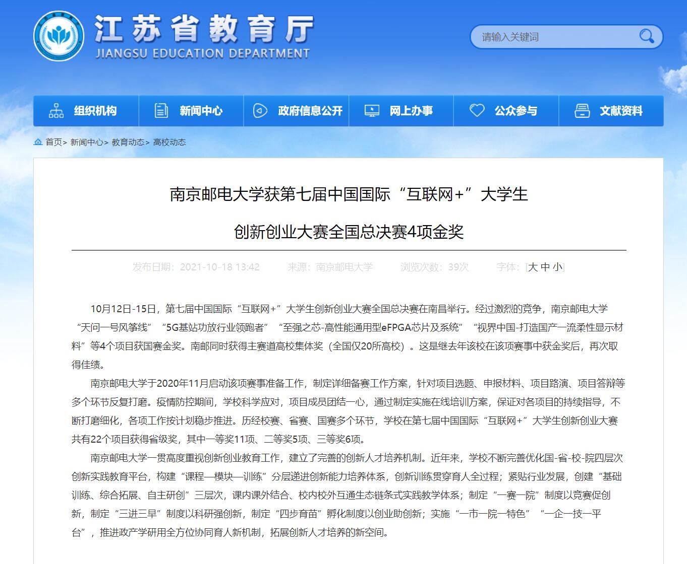 【省教育厅官网】南京邮电大学获第七届中国国际“互联网+”大学生 创新创业大赛全国总决赛4项金奖
