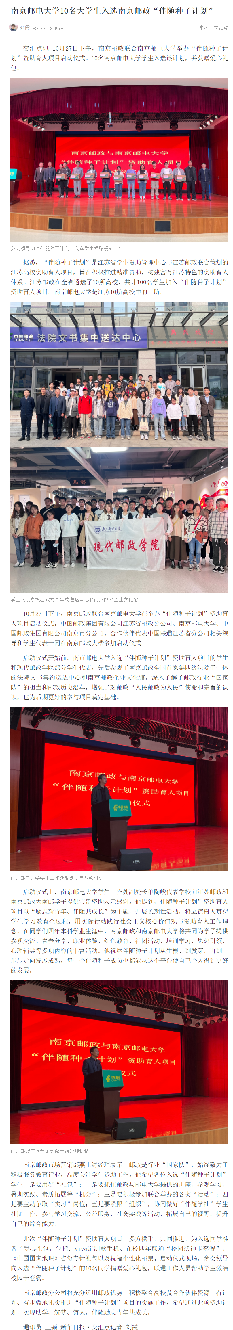 【新华日报客户端】南京邮电大学10名大学生入选南京邮政“伴随种子计划”