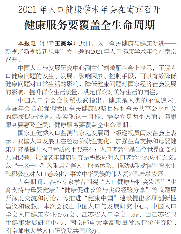 【人民日报海外版】2021年人口健康学术年会在南京召开 健康服务要覆盖全生命周期
