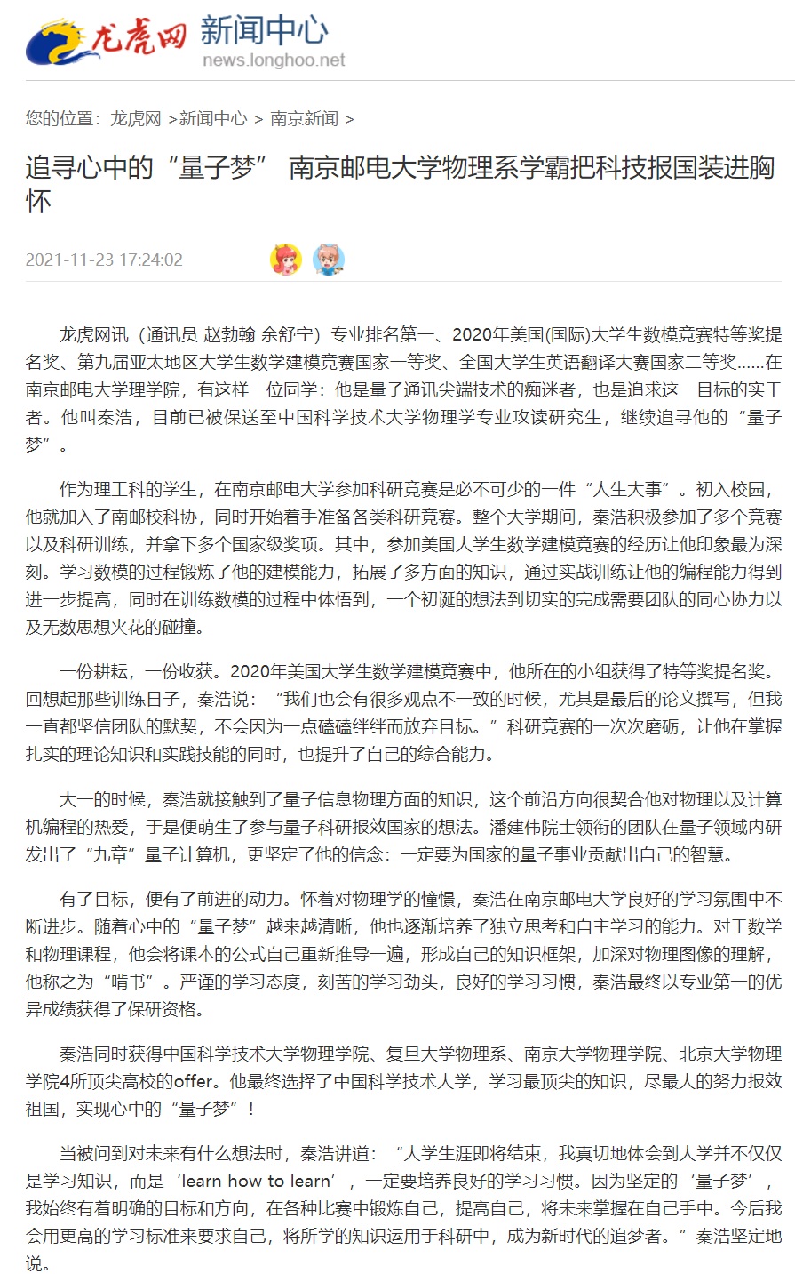【龙虎网】追寻心中的“量子梦” 南京邮电大学物理系学霸把科技报国装进胸怀