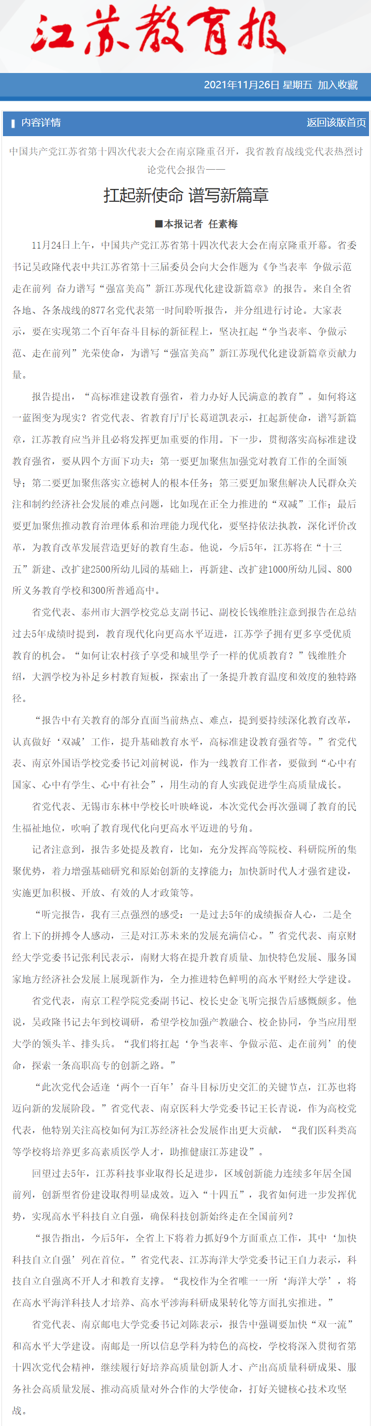 【江苏教育报】中国共产党江苏省第十四次代表大会在南京隆重召开,我省教育战线党代表热烈讨论党代会报告—— 扛起新使命 谱写新篇章