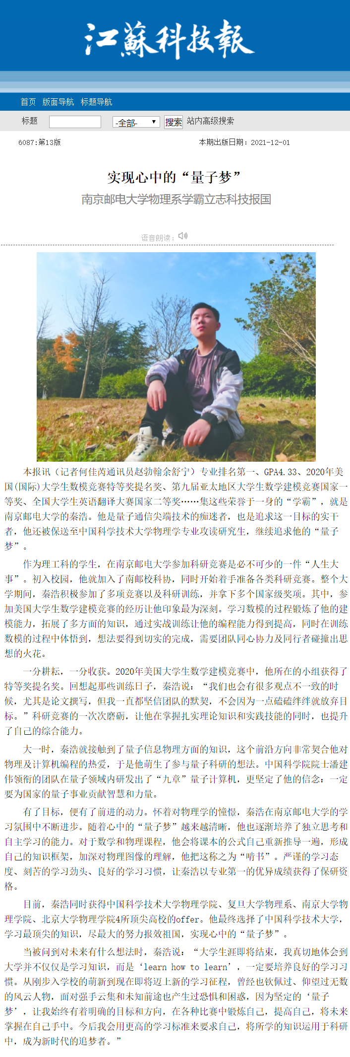 【江苏科技报】实现心中的“量子梦” 南京邮电大学物理系学霸立志科技报国