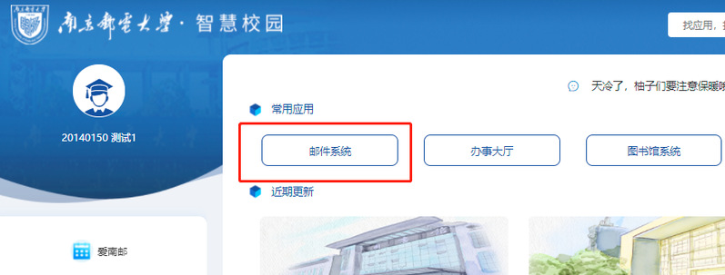 ①首次登录新版邮件系统,进入智慧校园门户后点击“邮件系统”。智慧校园地址:http://i.njupt.edu.cn。