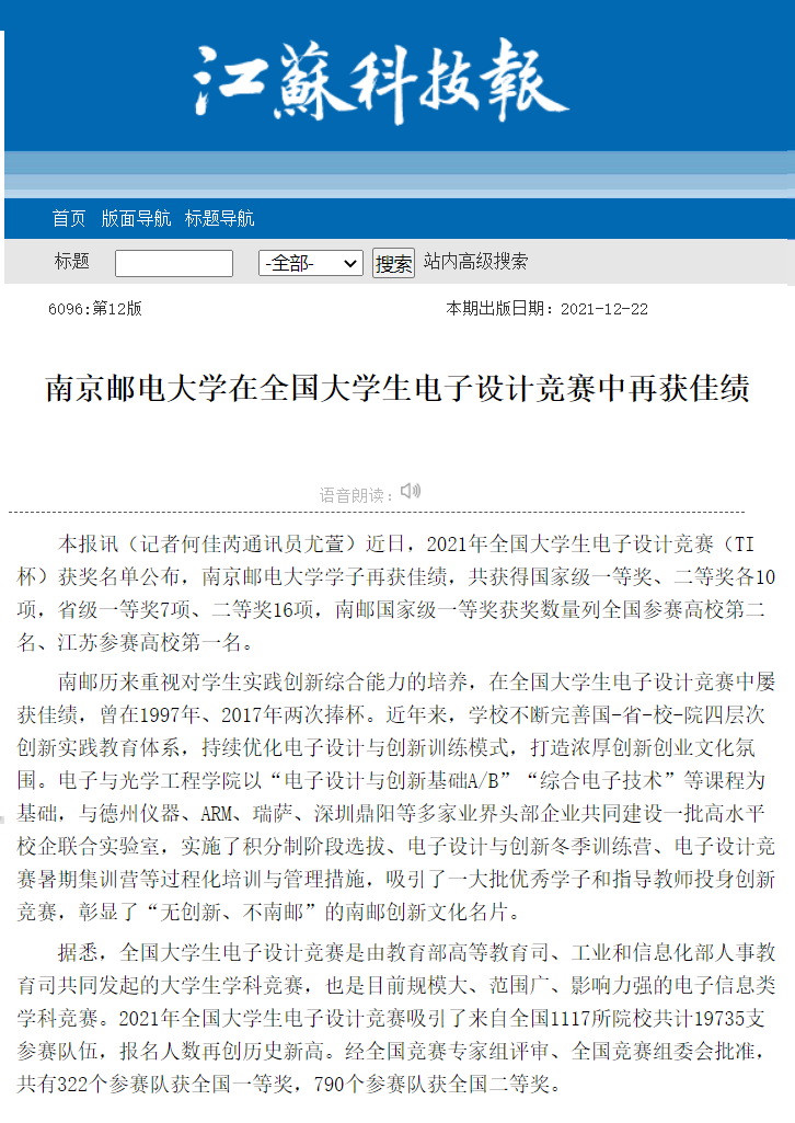 【江苏科技报】南京邮电大学在全国大学生电子设计竞赛中再获佳绩
