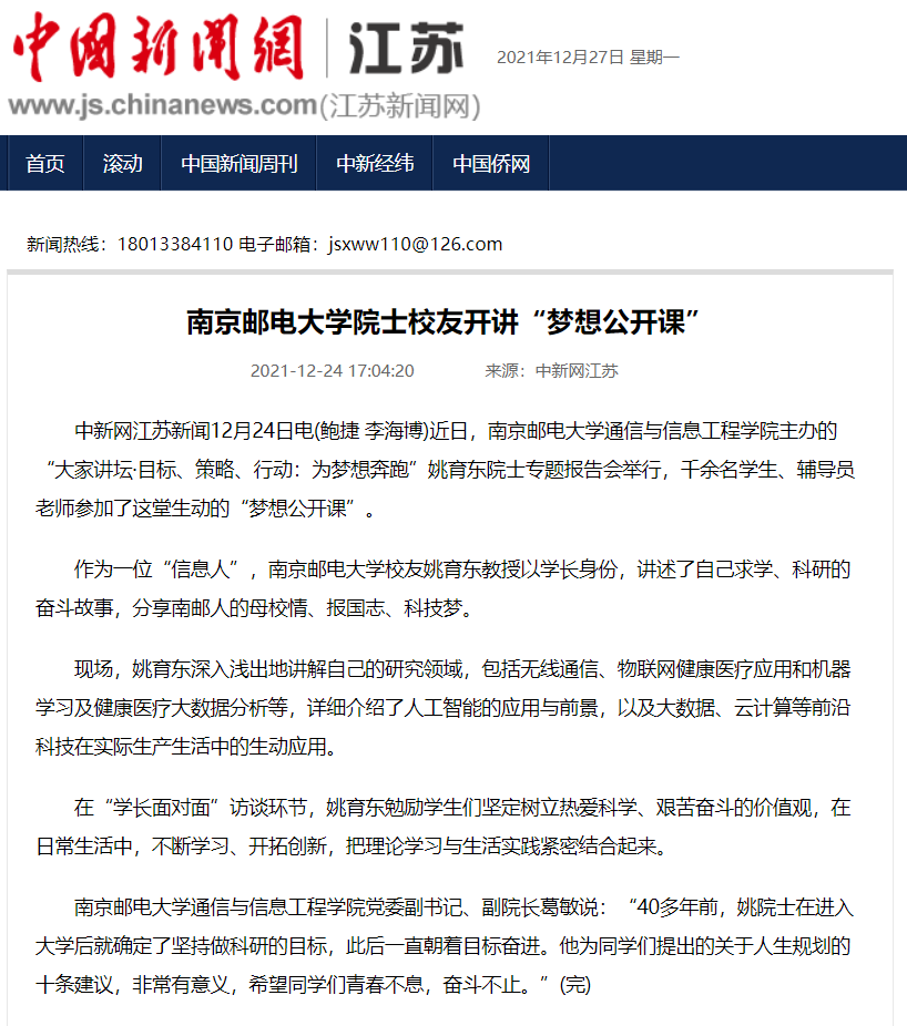 【中国新闻网】南京邮电大学院士校友开讲“梦想公开课”