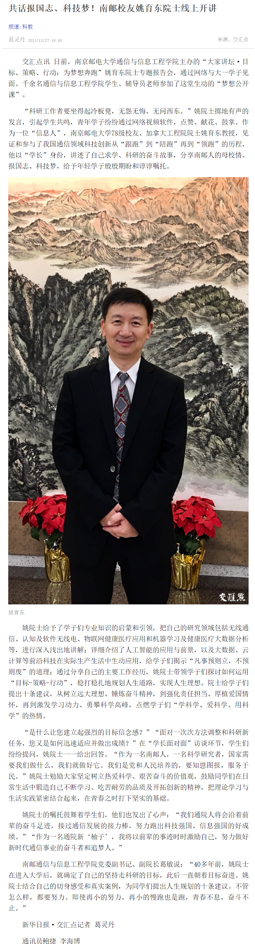 【新华日报客户端】共话报国志、科技梦!南邮校友姚育东院士线上开讲