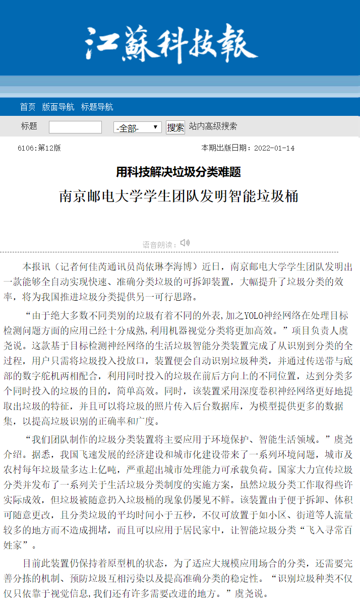 【江苏科技报】南京邮电大学学生团队发明智能垃圾桶