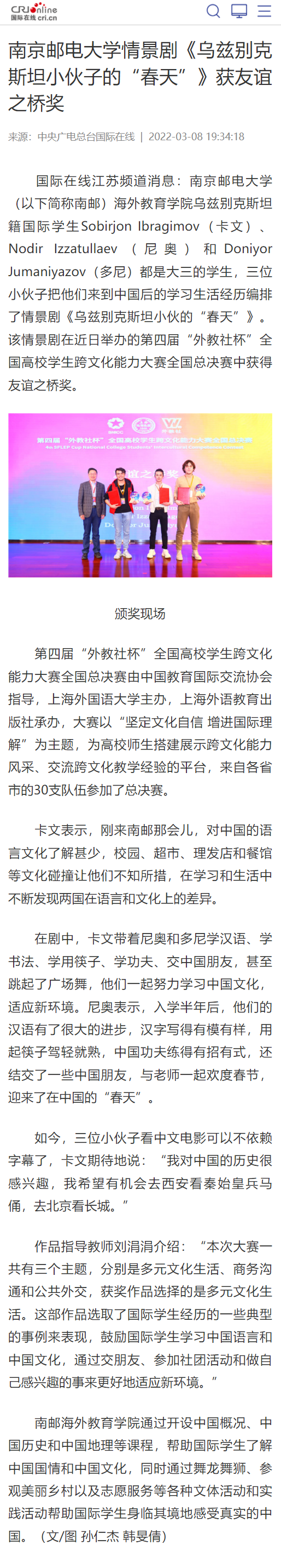 【中央广电总台国际在线 】南京邮电大学情景剧《乌兹别克斯坦小伙子的“春天”》获友谊之桥奖