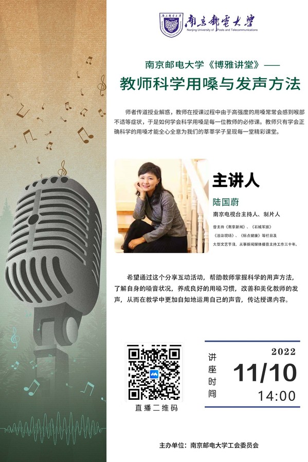 校工会文化润校系列活动——《博雅讲堂》将于11月10日(周四)14:00举办《教师科学用嗓与发声方法》讲座。