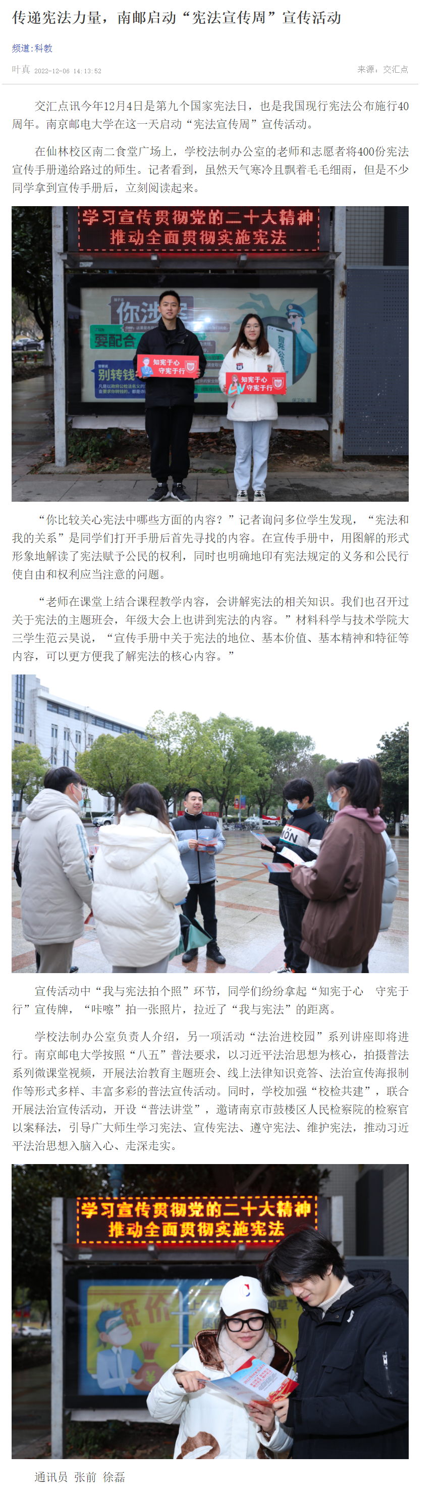 【新华日报客户端】传递宪法力量,南邮启动“宪法宣传周”宣传活动
