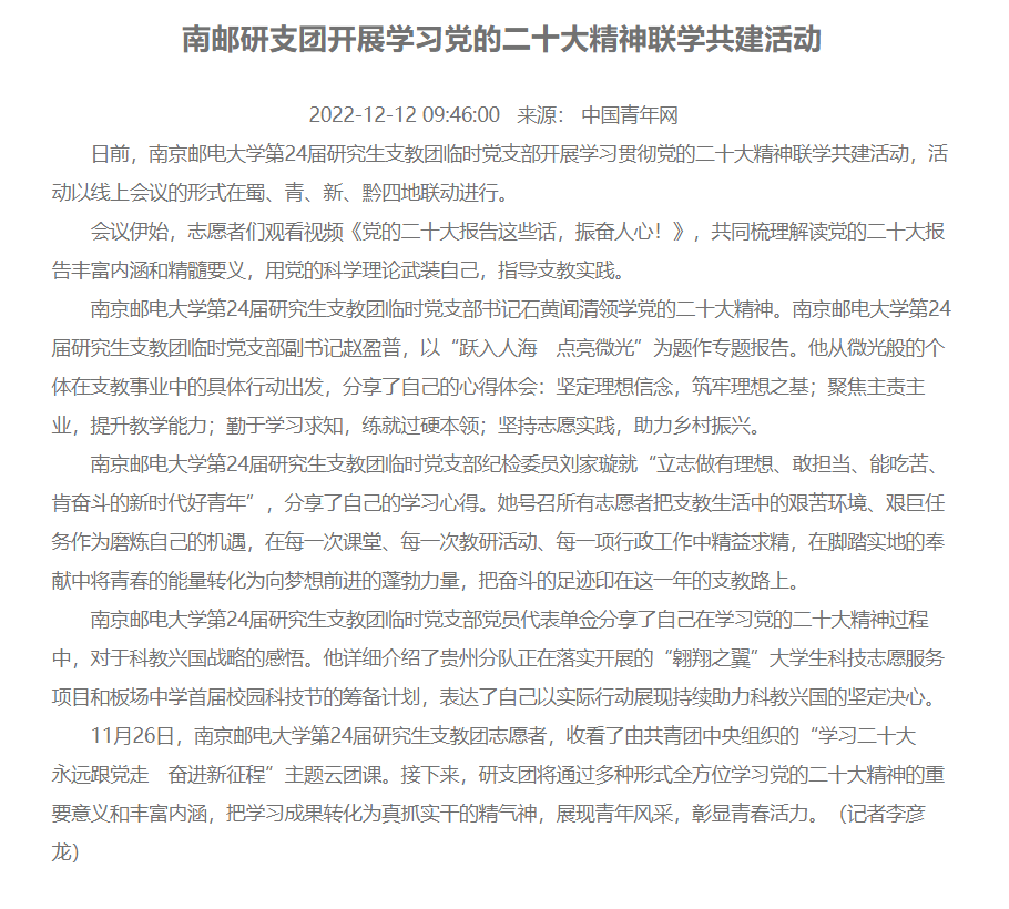 【中国青年网】南邮研支团开展学习党的二十大精神联学共建活动