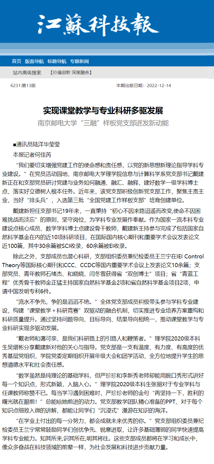 【江苏科技报】实现课堂教学与专业科研多驱发展