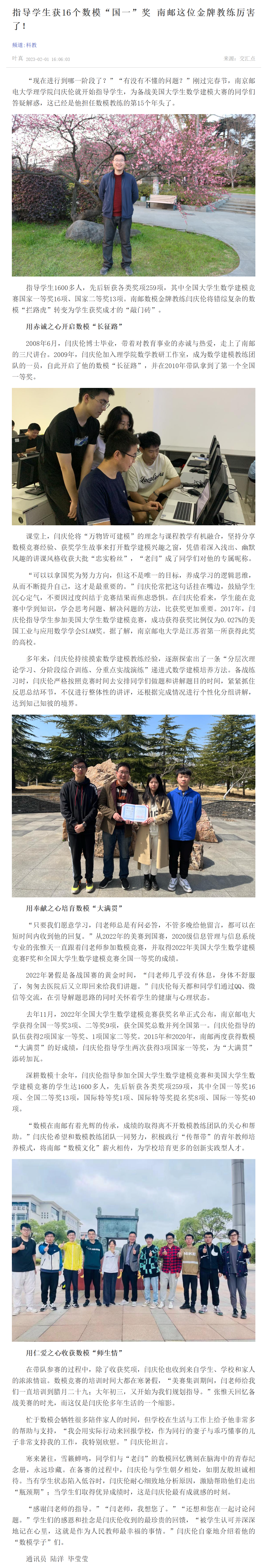【新华日报客户端】指导学生获16个数模“国一”奖 南邮这位金牌教练厉害了!