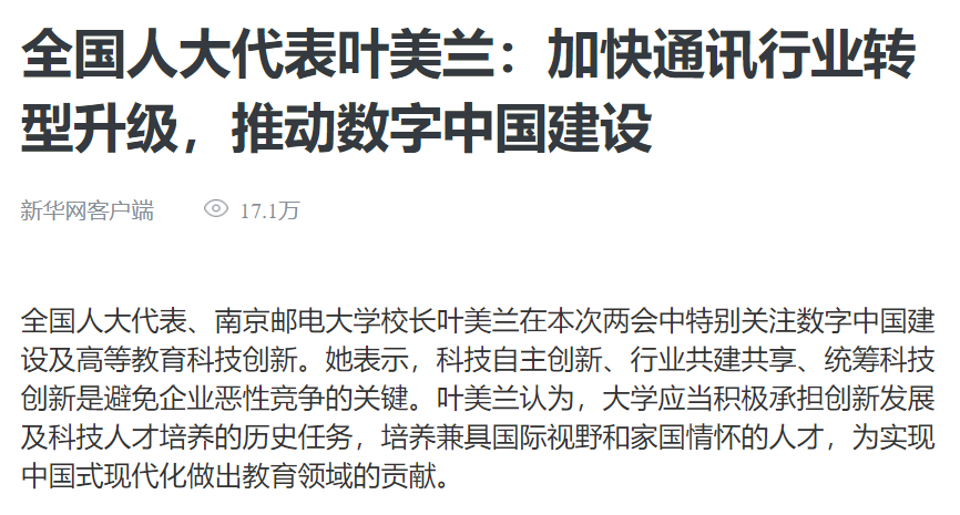 【新华网】全国人大代表叶美兰:加快通讯行业转型升级,推动数字中国建设