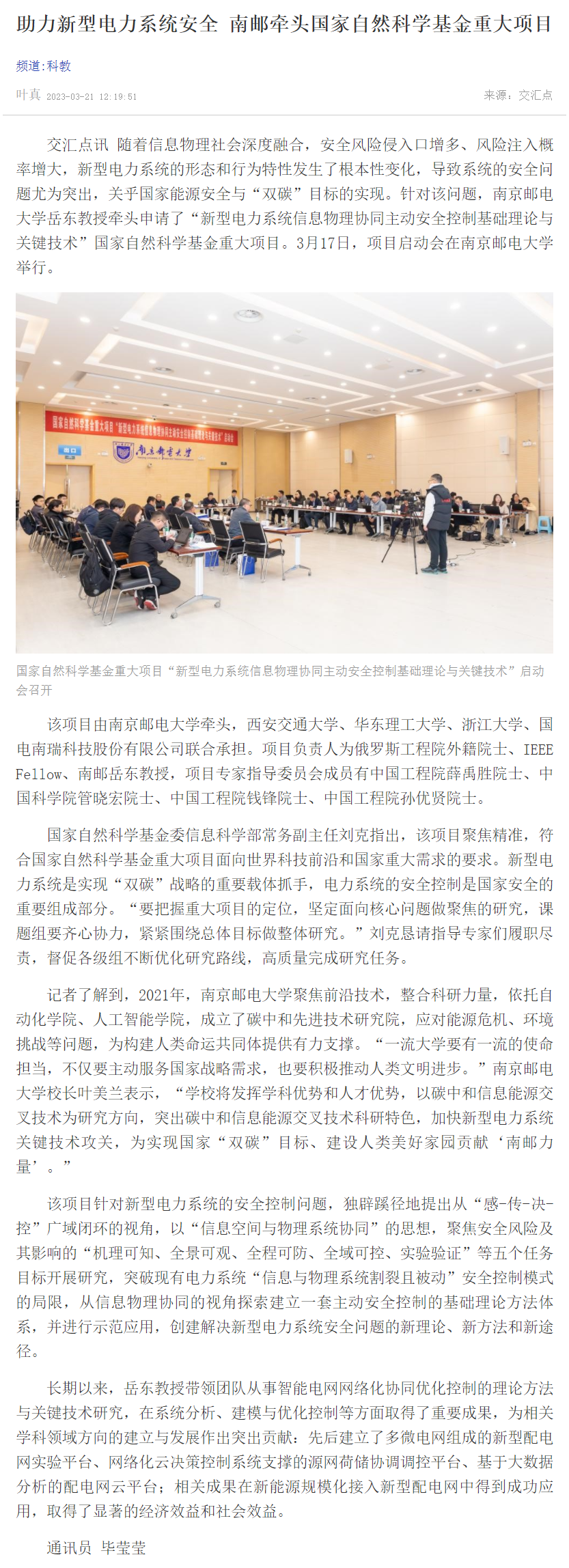 【新华日报客户端】助力新型电力系统安全 南邮牵头国家自然科学基金重大项目