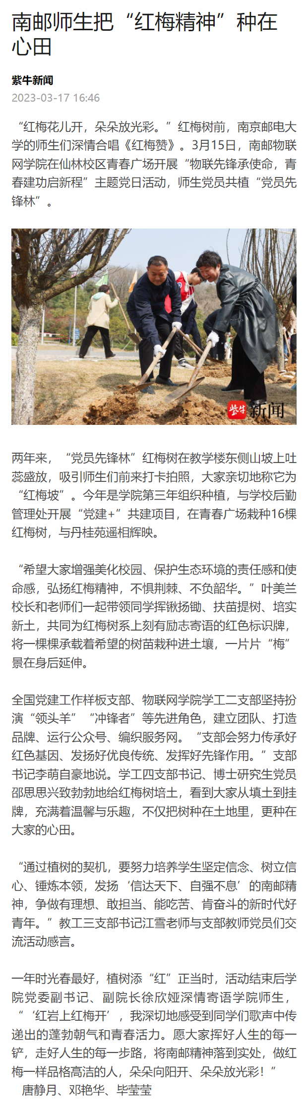 【扬子晚报客户端】南邮师生把“红梅精神”种在心田